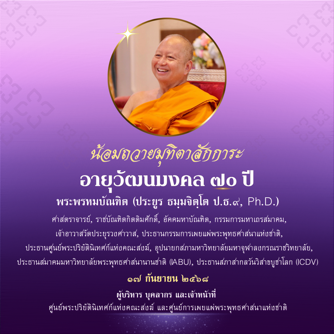 น้อมถวาย มุทิตา สักการะ อายุวัฒนมงคล ๗๐ ปี พระพรหมบัณฑิต (ประยูร ธมฺมจิตฺโต ป.ธ.๙, Ph.D.) ศาสตราจารย์, ราชบัณฑิตกิตติมศักดิ์, อัคคมหาบัณฑิต, กรรมการมหาเถรสมาคม, เจ้าอาวาสวัดประยุรวงศาวาส, ประธานกรรมการเผยแผ่พระพุทธศาสนาแห่งชาติ, ประธานศูนย์พระปริยัตินิเทศก์แห่งคณะสงฆ์, อุปนายกสภามหาวิทยาลัยมหาจุฬาลงกรณราชวิทยาลัย, ประธานสมาคมมหาวิทยาลัยพระพุทธศาสนานานชาติ (IABU), ประธานสภาสากลวันวิสาขบูชาโลก (ICDV)